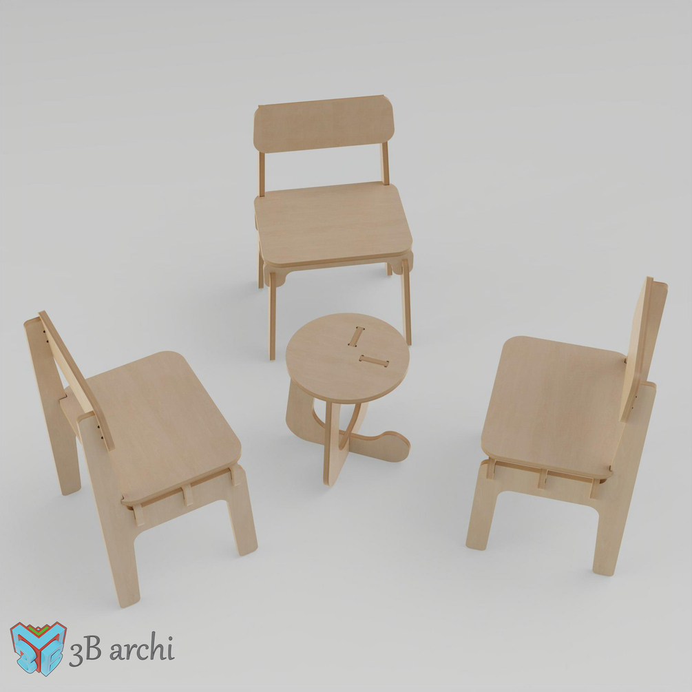 A project for Kids. chair and a small table of plywood. Vector drawing, in electronic format. 3D model, 3D puzzle project table for CNC machine. Drawing-vector cutting plan. Suitable for laser cutting and milling. You're done by downloading the file and modifying the data to suit your requirements. After cutting, you can paint it in any color or decorate it with decorative elements, ideal for decorating any room, house, or apartment. The product can be made of plywood and wood.